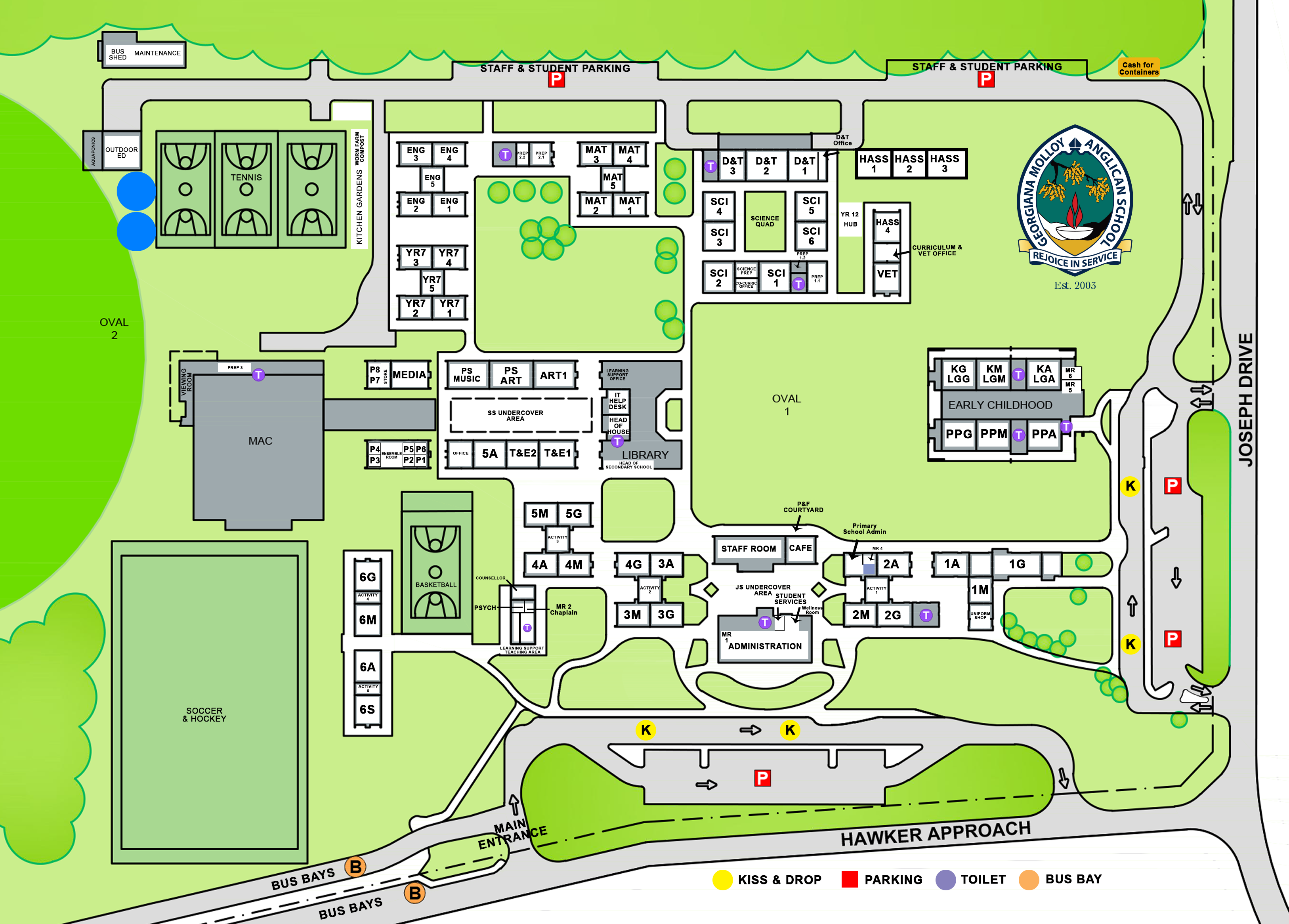 Our school is situated on 15 hectares of beautiful open planned grounds in Yalyalup, a five minute drive from Busselton, Western Australia. Our campus can be accessed via Joseph Drive or Hawker Approach. We have two Kiss & Drop facilities for parents dropping off or picking up children. Parking is available in several locations as marked on the Campus Map.