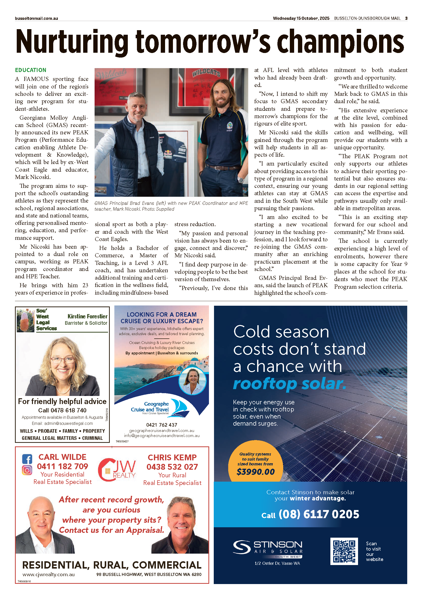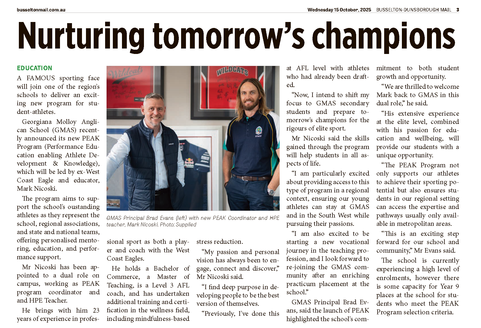 The program is driven by Mr Mark Nicoski - former West Coast Eagles player, coach and wellness advocate - who brings unmatched energy and experience to inspire student growth, wellbeing, and mental strength. Successful applicants will gain firsthand insight from his passion for helping young people thrive.